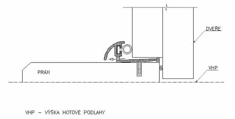 Pokud máte například dubový nebo i jiný dřevěný práh, pak je možné využít montáž dodatečné hliníkové lišty s odtokem přímo na něj. Princip popisujeme na obrázku. V tomto případě se jedná o dveře s prodlouženou vnitřní deskou.